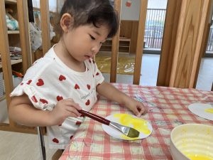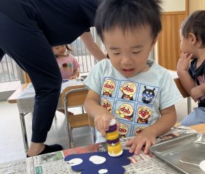 ぶどう組は毛糸をぐるぐる巻いてススキの穂を作り、葉っぱとうさぎさんの耳をはさみで切って、お月様を絵の具で塗りました。
