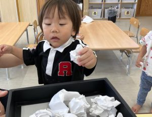 もも組は足型をとってうさぎさんに、びりびりした紙をススキにしました。