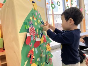 クッキーが焼けるまで、ツリーの飾り付けをしました!
