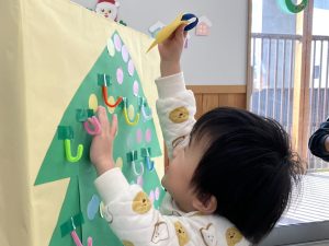 事前にお帰りの時に丸シールで少し飾りつけをしてもらったツリー。