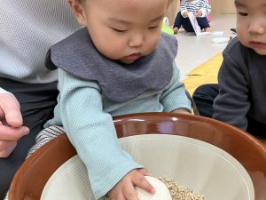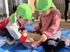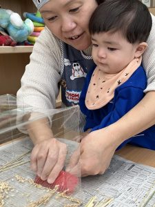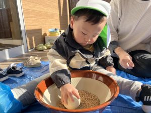 テラスで先生がやっていると、何をやっているのだろう?と子どもたちが見に来ました。