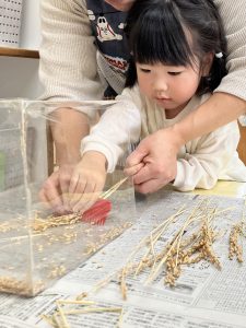 櫛に稲を引っ掛けて引っ張るとなんと不思議。