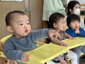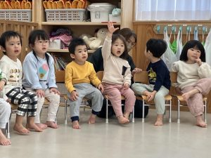 指差しで楽しむお友達、手をあげて答えているお友達、